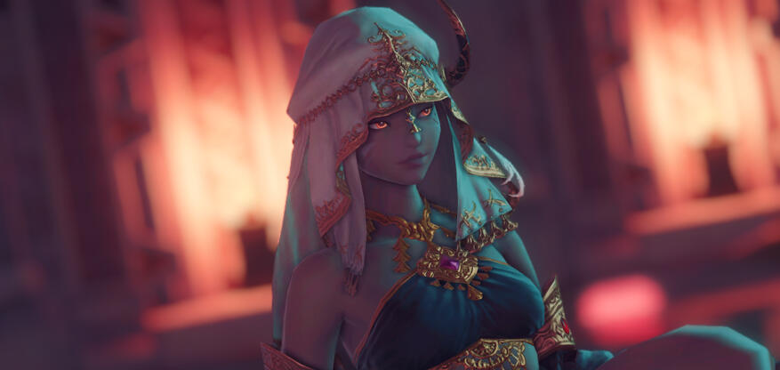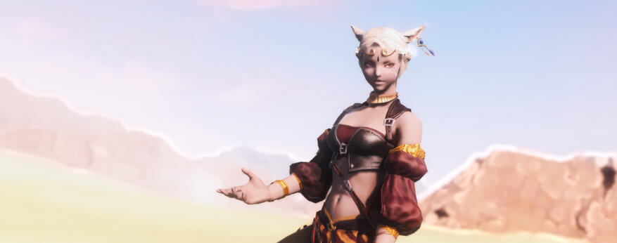 This Miqo’te doesn’t immediately come off as beautiful, so much as striking in her looks. With facial features perhaps a bit too exaggerated, she might seem awkward if not for the utter confidence she carries herself with. Luminous orange eyes lined in dark khol are bright with a keen gaze, while her lips bear an often mischievous tilt. She stands quite tall for a Miqo'te woman and her stature seems that much more exaggerated for her lithe, dancer's build.Her age is difficult to discern, her only tell being the faint lines that appear at the corners of her eyes when she smiles. Thavnair is known for its peerless alchemy after all.Her ears and nose are adorned with several small piercings, and gem sits at her brow. She seems to favor airy, flowing garb, suited for heat.